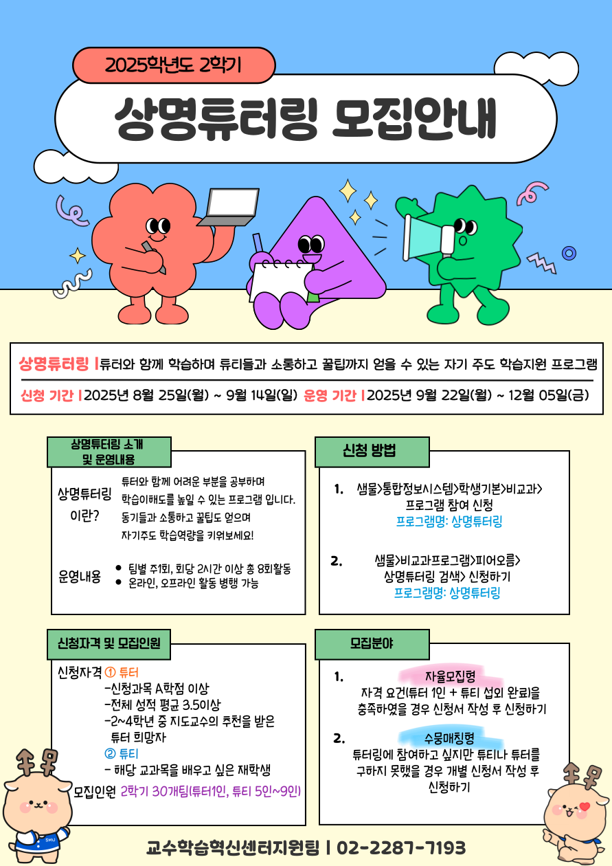 서울 [비교과] [교수학습혁신센터지원팀(서울)] 2025학년도 2학기 상명튜터링 모집 연장 안내(~9월14일) -