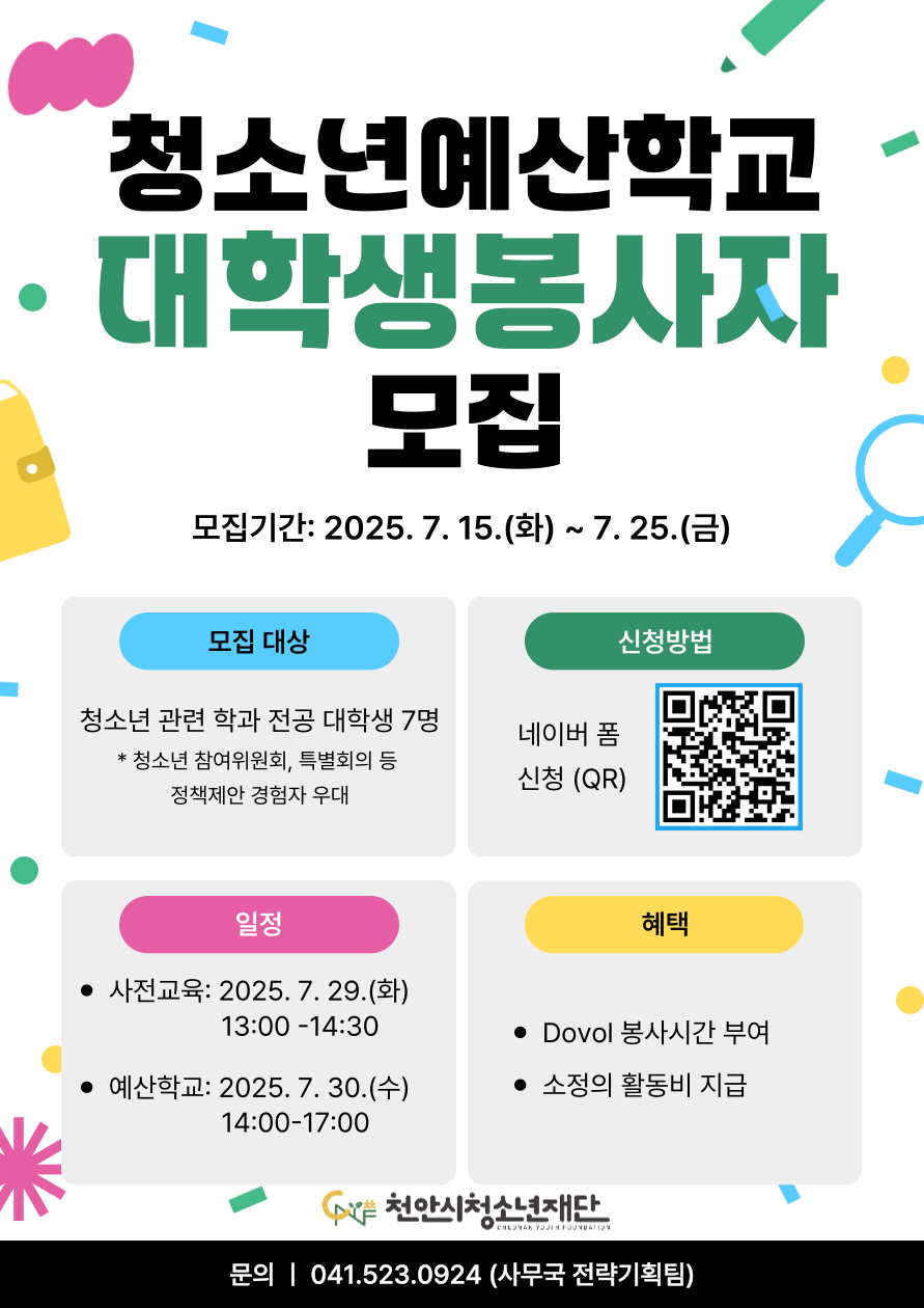 천안 [일반] 「2025년 청소년 예산학교 대학생 봉사자 모집」안내 -